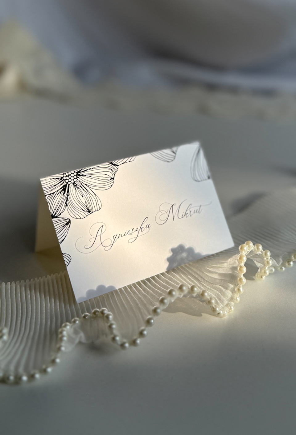 Elegancka składana winietka o wymiarach 6x9cm(po złożeniu), drukowana na gładkim papierze z satynowym wykończeniem o gramaturze 256g/m3.
