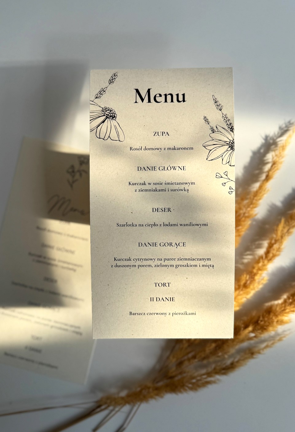 Menu w formie pojedynczej karty o wymiarach 11×21 drukowane na ekologicznym papierze o gramaturze 246g/m3.