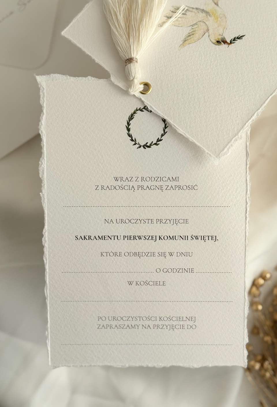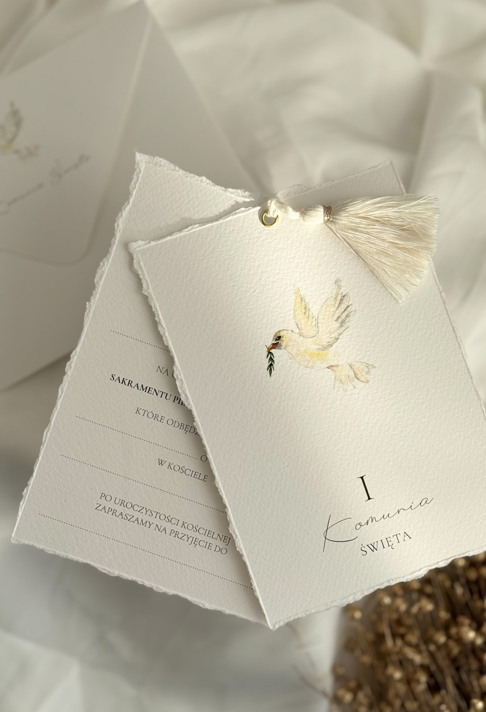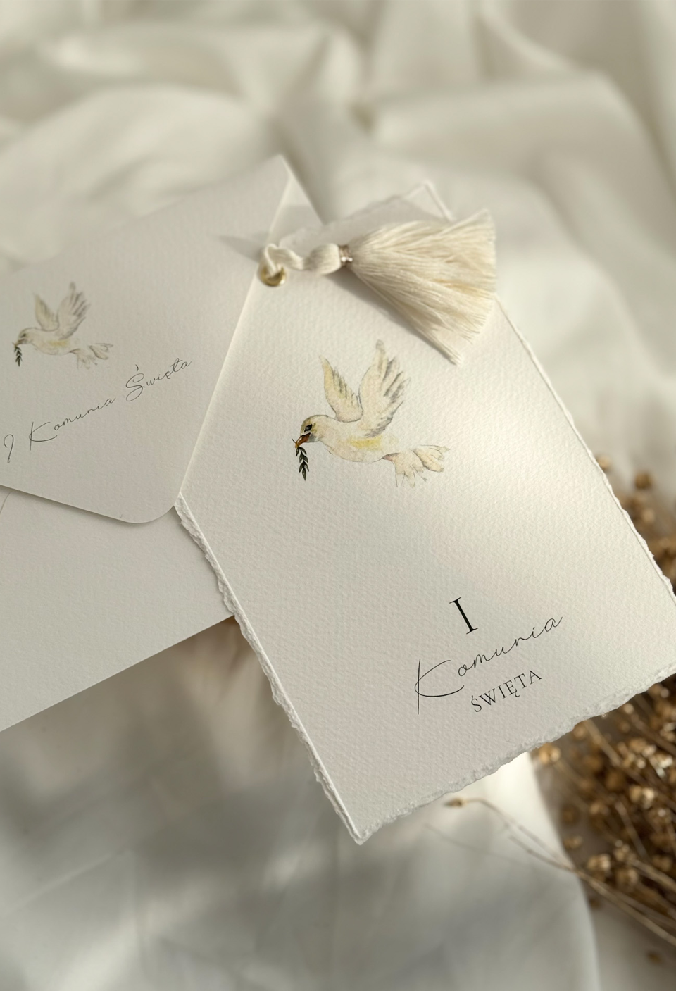 Subtelne zaproszenie komunijne z akwarelowym motywem gołąbka i dekoracyjnym frędzelkiem. Naturalne, eleganckie i przygotowane do samodzielnego wypisania.